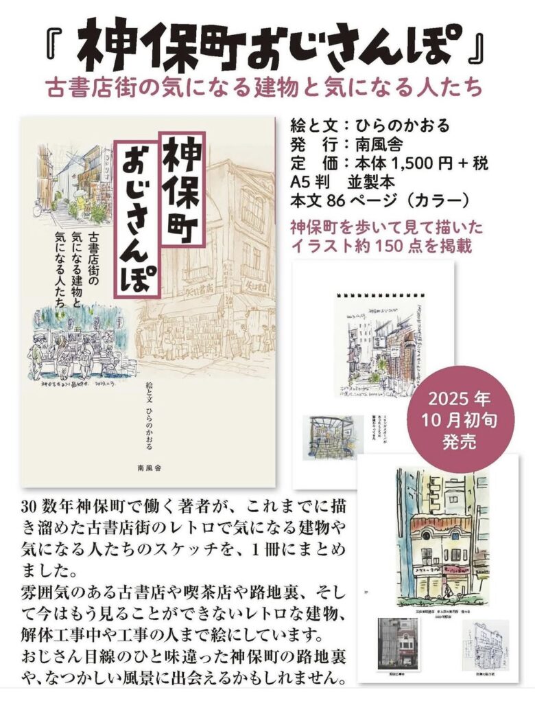 ひらのかおる「神保町おじさんぽ 古書店街の気になる建物と気になる人たち」が発売されました。 2025/10/06 https://www.nampoosha.com/%E5%87%BA%E7%89%88/%E7%A5%9E%E4%BF%9D%E7%94%BA%E3%81%8A%E3%81%98%E3%81%95%E3%82%93%E3%81%BDhttps://www.instagram.com/jimbocho_ojisanpo_jazz/
